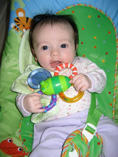 It's hard to believe that Lily is 3 month's old today! She is becoming such a big girl! She loves it when Jim or I get the camera out and take pictures (which is often), she thinks the flash is funny! She will talk to us or her favorite toys all the time, and she gets so excited....she will just squeal and smile and keep on talking. She likes to stare at her hands and now she is beginning to hang on to toys that we hand to her as you can see with the ball up above. She is doing so good with her sleeping at night. Her bedtime is around 8-8:30 and she usually sleeps 8-10 hours. She still loves bath time. If she is upset before bathtime as soon as we put her in the water she is so happy. She'll get excited sometimes and splash Daddy with water! We've recently put up the Christmas trees, and she loves to look at all the colorful lights!